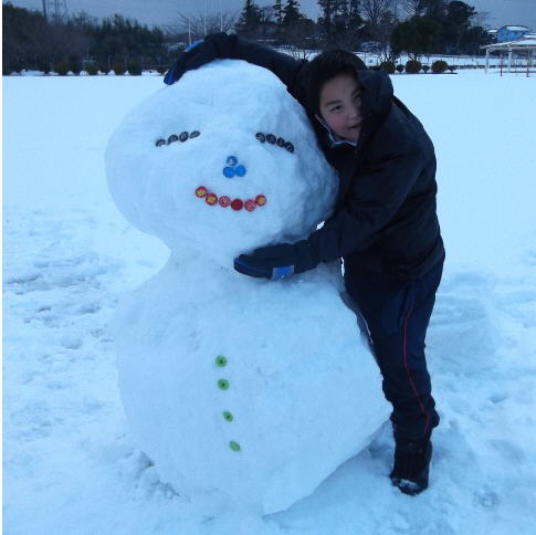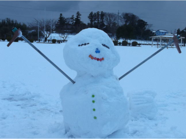 大人にとっては雪は迷惑そのものですが、児童にとっては格好の遊び道具になります。昨日、5年生の男児1人で雪だるまを作って見せてくれました。自分の身長ほどの大きな雪だるまです。つもった雪はかなり重くて、頭の部分は先生に手伝ってもらわないと上に置くことができないほどだったようです。