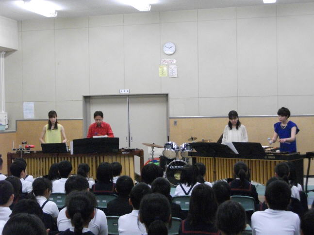 16日(火)5限目に「打楽器演奏会」がありました。子供たちにプロの演奏を聴かせることができました。アンサンブル金沢打楽器奏者の渡邉昭夫さんやマリンバ演奏の神谷 紘実さん他2名を迎え、「剣の舞、アイネ・クライネ・ナハトムジーク、クリスマスメドレー」など演奏してくれました。4人の見事なボディーパーカッションもあり、子供たちは音を創り出す楽しさや演奏の響きにうっとりして聴き入っていました。最後に、アンコール曲として児童が今月の歌で歌っていた「涙そうそう」の演奏で全体合唱をすることができました。子供たちにとって、普通の学校では味わうことができない貴重な日となりました。自分もこの企画をして大変良かったと感じています。
