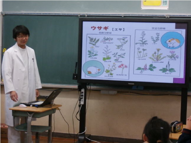今日は委員会活動の日でした。先日からたびたび登場しているウサギについて、いろいろと知識を深める機会がありました。市の飼育動物サポート事業で田村動物病院の院長が学校に来てくださいました。そして、学校に飼っているウサギについて専門家の立場からお話され、いろいろと学ぶことができました。ウサギの好む野草やウサギのオス・メスの見分け方、ウサギの正しい抱き方など、これからお世話する上で、とても参考になりました。