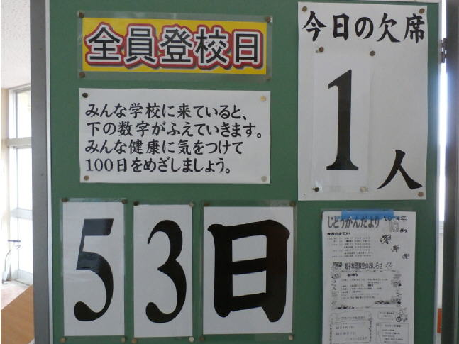 学校には多かれ少なかれ友達同士のトラブルはあります。しかし、そのトラブルも先生やまわりの友達が関わって解決しながら児童は成長します。昨日もちょっとしたトラブルはありましたが、担任がじっくりと子どもに分かるように説諭し、解決しました。もちろん、不登校も0です。全員学校に登校している幸せを玄関前の掲示板に数字に表しています。なお、年間に児童が登校する日は200日で、4月から授業をした日数は今日で124日です。欠席0の日が最低80日を目標にしています。