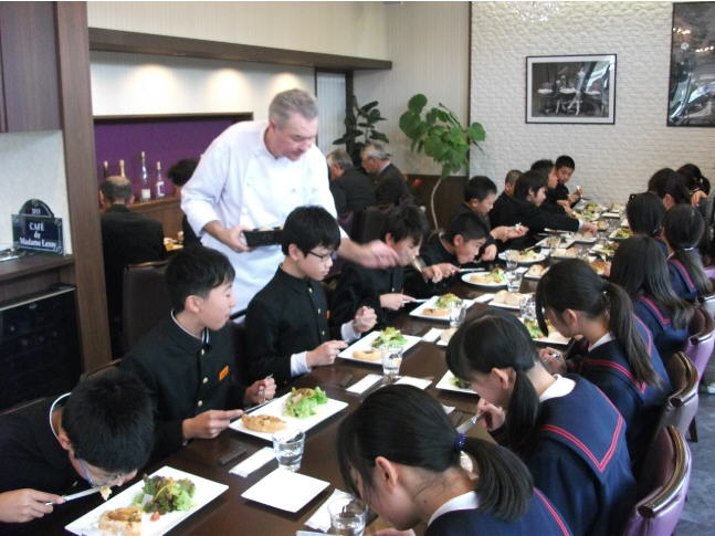 6年生24人全員が高松ライオンズクラブ主催の「テーブルマナー教室」に招待されました。これからの子どもは、外国料理のマナーを身に付けないと国際人にはなれないとライオンズクラブの粋な計らいを受けました。