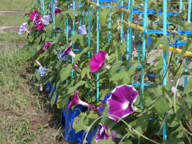 1年生が毎日水遣りをしているアサガオに花が咲きました。「ぼくの花j、3つ咲いたよ」「昨日予想していたとおりこの花が咲いているよ」「昨日の花は、しぼんでしまったな」など、いろいろと教えてくれました。1年生は1つ1つ見るもの聞くものが勉強です。アサガオは咲く時刻に決まりがあります。花のお世話を通して、植物に興味を持ってほしいと思います。そうすることによって自分の世界が広がりますね。