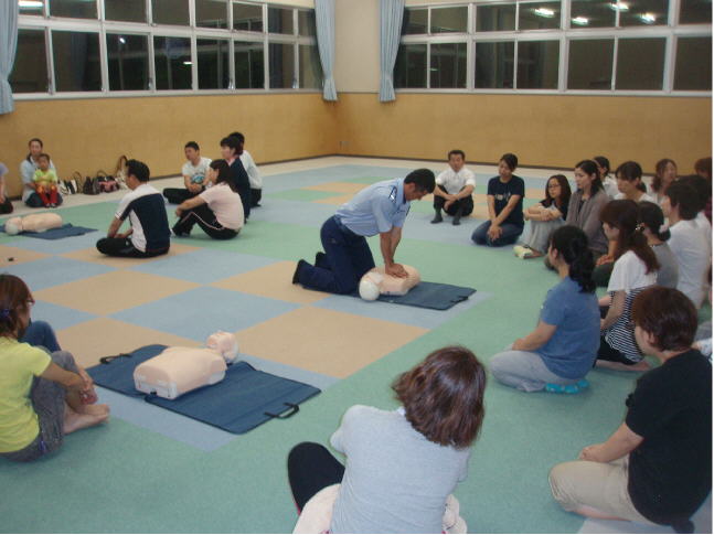 消防署の方2名を講師に迎え、心肺蘇生法とAEDの正しい使い方を学びました。初めて参加する方もいて、真剣な表情でした。