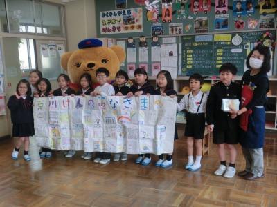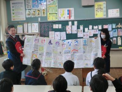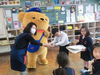 本日、1,2年生がお手紙教室を行いました。二ツ屋郵便局様のご協力のもと、12月にもご来校いただいた山崎順子先生をお招きして、1年教室で実施しました。今回は、大阪泉大津市の小学生が能登半島地震で被災された石川県の人たち宛に応援メッセージを書いてくれたのですが、それを持って来校され、紹介していただきました。また、いろいろな面白はがきも紹介していただき、日本郵便のキャラクターである「ぽすくま」くんも来てくれて、子どもたちは大喜びでした。応援メッセージは、しばらく校内で掲示した後、かほく市役所にも展示したいと考えています。本当にありがとうございました。