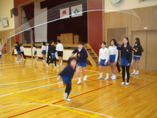 それぞれのグループで3分間でどれだけ跳ぶことができるかを競いました。もちろん、跳んだ回数ですから引っかからないように、注意を払いながら跳びました。3分間で、200回以上も跳んだグループ過半数あり、今まで練習をしてきた成果が出てきたと思いました。グループ種目はすぐにはできないものです。最高記録を更新したグループもあり、大声を出して、喜んでいました。