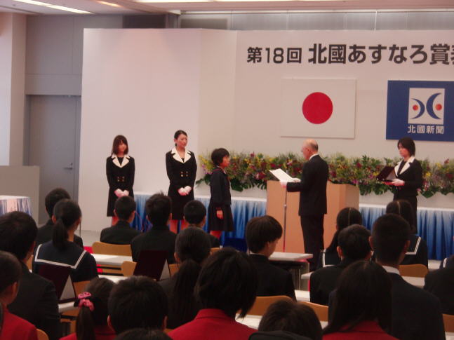 さて、授賞式を終えた後、今度は金沢の北國新聞本社まで行ってきました。北國あすなろ賞に大海小学校のみどりの少年団が受賞しました。社会に貢献し、活躍している団体に賞が贈られます。みどりの少年団は、学校林の整備や募金活動、伐採の木材からプランターをつくるなど幅広い活動が認められました。今後も人のために役立つ児童になってほしいと願っています。