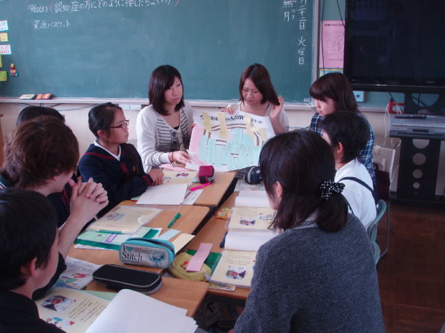 22日3,4限に看護大学生10数名をお迎えして、認知症の学習会を行いました。認知症になった人が自分が思っていることや予想できることと違う行動をしたときのケースカンファレンスを学習しました。例えば、つい先ほどまで一緒にご飯を食べたのに、「ご飯、早く食べたいなぁ。」と言った時の対応はどうすればいいのか、大学生と6年生と一緒に考え、その状況で考え得ることをみんなで学びました。高齢化社会になっています。今後、認知症は地域でもご家庭でも考えなければならない問題です。ご家庭でも児童を囲んで、話題にしてはいかがでしょうか。