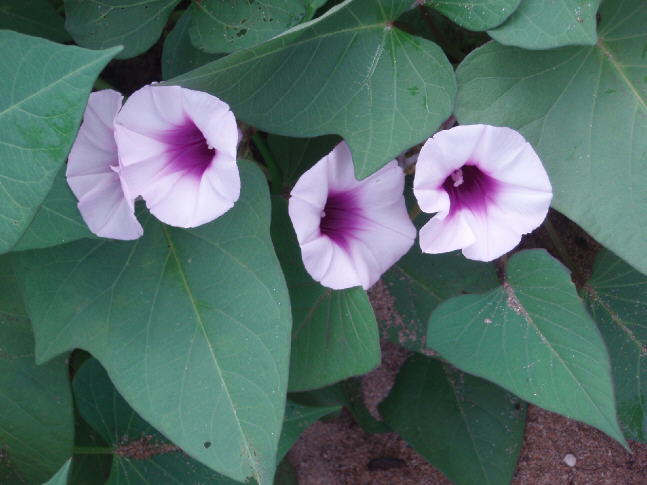 さて、夏を迎えると、毎年自分の家ではサツマイモの花が咲きます。ただし、花が咲くのは「アヤムラサキ」という品種だけです。サツマイモは、ヒルガオの仲間です。沖縄に行くと、サツマイモ畑は花がいっぱい咲いて、とてもきれいです。サツマイモは短日植物で、昼の時間が短いときに花が咲くのですが、サツマイモが育つ夏は石川では昼の時間が長すぎて、花を咲くことが普通できないのです。でも、南に行くほど昼の時間は短いので、沖縄では花が咲くというわけです。ただ、どういうわけかこのアヤムラサキという品種だけは毎年花を咲かせてくれます。皆さんもサツマイモを咲かせてみたいと思ったら、この品種をお薦めします。