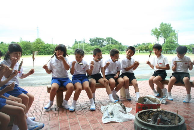 今日は、雨が降らなければ3年生は、大海川で鮎釣りをする予定でした。あいにくの雨で、釣りは中止になりましたが、地元漁協の協力で、事前に準備していた鮎を学校の運動場側の軒下で焼くことができました。漁協の組合長竹多さんのお世話でおいしい鮎を提供していただき、串に刺して、塩をかけ、炭火で焼いてくれました。大海の自慢を総合的な学習で勉強している3年生は、鮎を食べたくて食べたくて・・・。それが、叶い幸せな1日になりました。なお、ご多用の中、わざわざ学校に来て鮎の世話をしていただきました竹多さん、どうもありがとうございました。