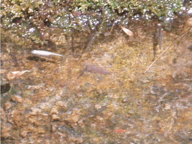 6年生の児童が池に放したメダカがようやく見えるようになってきました。池の水が濁っていたのと葉や泥で見えにくかったのです。毎日少しずつ池の泥をすくい上げ、かなり透明な水になってきました。児童も興味を持って、毎日池をのぞいています。とくに、6年生と1,2年生は朝必ず池を見て、メダカを見ています。池には、白メダカ、黒メダカが十数匹います。まだまだ観察するには少なすぎます。ご家庭にメダカを飼っていて分け与えるだけいましたら、池に放流願います。見えにくいですが、画像には白メダカ1匹と黒メダカ2匹いるのが分かりますか。