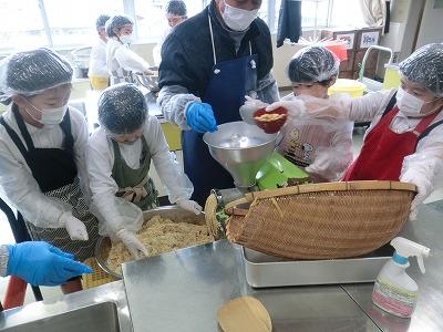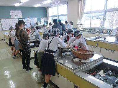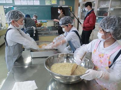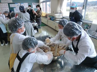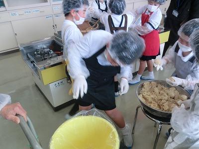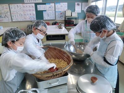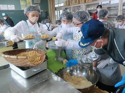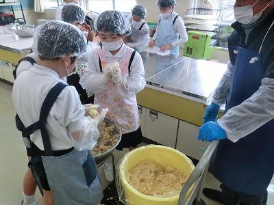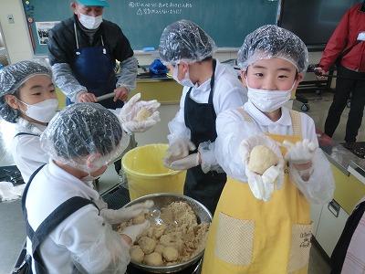 本日3,4限目には、髙﨑さんのご指導の下、3年生が味噌づくり体験をしました。1学期から育ててきて、2学期に収穫した大豆を使って、3学期はいよいよ味噌づくりです。子どもたちは、2時間ほど蒸した大豆をかき混ぜながら冷まし、機械を使ってミンチ状にし、塩、麹と合わせてかき混ぜ、だんご状にして桶に投げ入れました。とてもテキパキ動いてくれたおかげで、予定より早く作業を終えることができました。