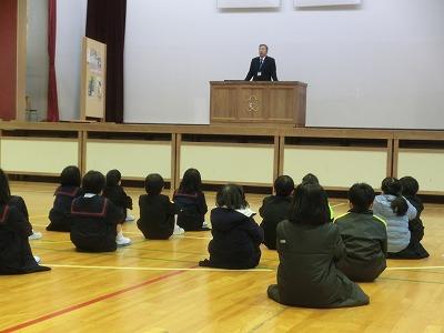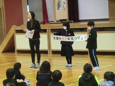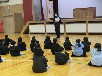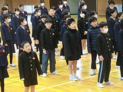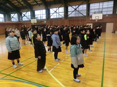 今年も早1か月が過ぎました。1限目に2月の全校集会を体育館で行いました。まず、「税のポスター」と「校内書初め大会」「校内百人一首大会」の表彰伝達がありました。続いて1月の生活目標の振り返り、2月の生活目標「友達のよさを見つけよう」についてのお話があり、最後に1月の歌「この星に生まれて」を全校で歌って終わりました。とても素敵な歌声で、2月も頑張ろうと思える素敵な集会でした。