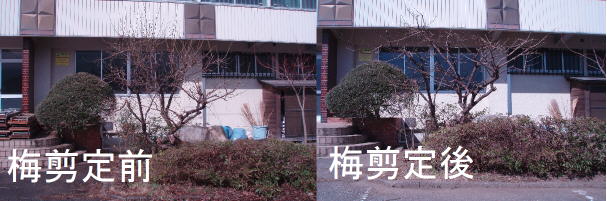 転任してずっと体育館玄関横の木々がぱっとしないと思いつつ、今日まで至りました。木々の冬眠時期に、こぎれいにできないかと梅の剪定を行いました。画像では余り変わってはいませんが、実際にはかなり剪定を行いました。