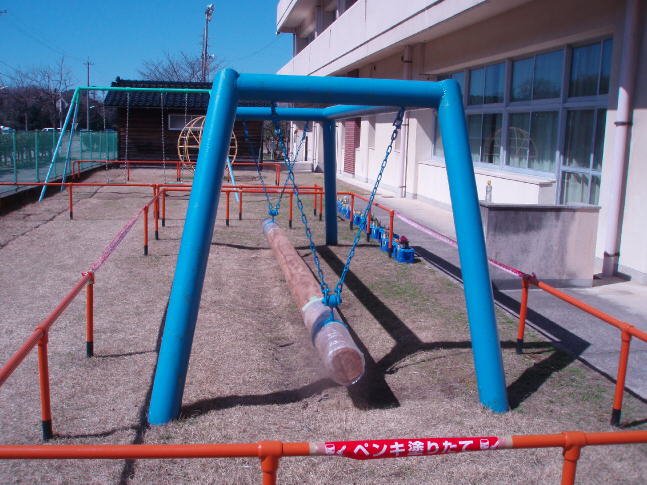 丸太が古くなり、ささくれのため一年間使用禁止のブランコがリニューアルされました。かほく市管理公社のおかげで、立派な丸太をつり下げていただきました。今日の午前に取り付けていきました。取り付け部分にペンキを塗っていきましたので、数日後から使うことができると思います。低学年の皆さん、休み時間や放課後ルールを守って、使いましょう。