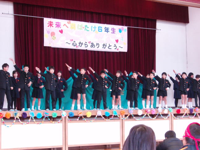練習を重ねて約1ヶ月、今日「6年生を送る会」がありました。5年生は、各学年の出し物を調整したり、掲示物や会場の配置など考えたり、かなり大変でした。一人ひとりが責任を持ち、役割を実行してこそ、会が成功することを体験できたと思います。お疲れさま。