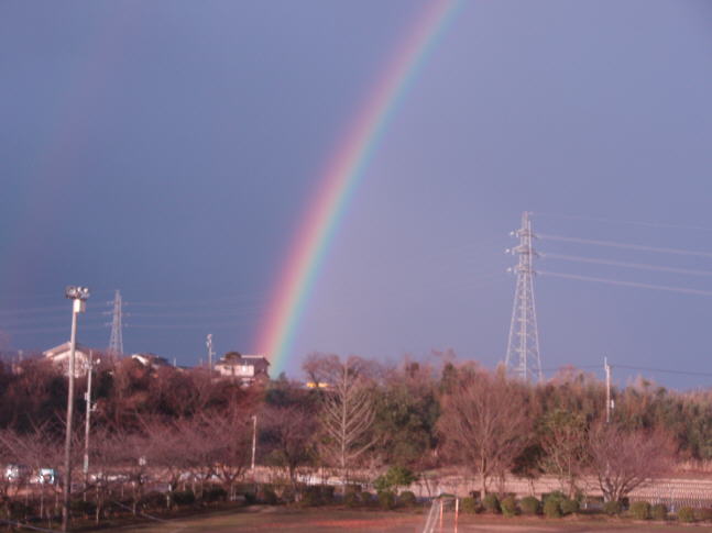 今日、児童が登校する時間にきれいな虹を見ることができました。知っている人も多いと思いますが、虹は太陽を背にしてできます。そして、角度の関係から、日の出や日の入りの時の虹は大きくて、お昼近くは、小さい虹ができます。