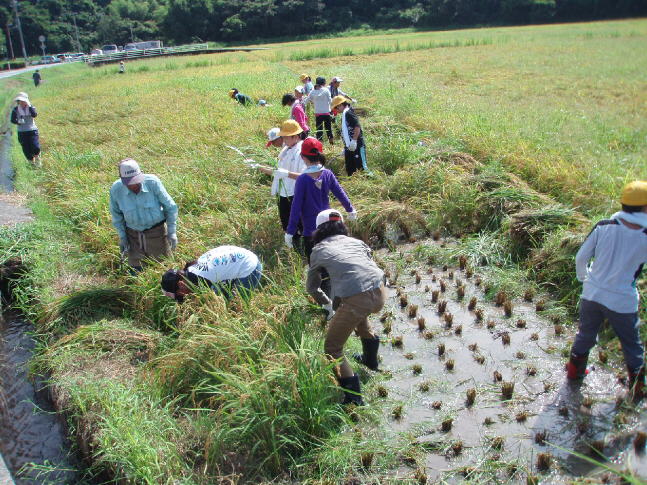さて、ぬかるんだ田の中で自由に動くことができないようでしたが、みんなで力を合わせて刈り取ることが出来ました。