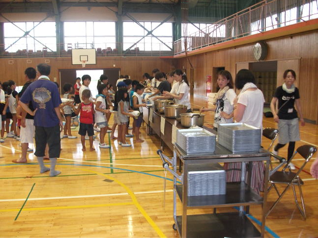 PTA会長の呼びかけでお泊まり会を実施しました。親子の参加人数は100名を超え、大変盛り上がりました。全員5時に集合してから、夕食のカレーライスをいただきました。細かな心遣いで甘口、中辛、辛口の3種類があり、お好みの辛さを選ぶことが出来ました。みんなと一緒に食べると余計美味しく感じる物ですね。高学年はほとんどの人がお代わりをしていました。作っていただいた方には本当に感謝ですね。