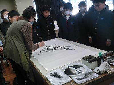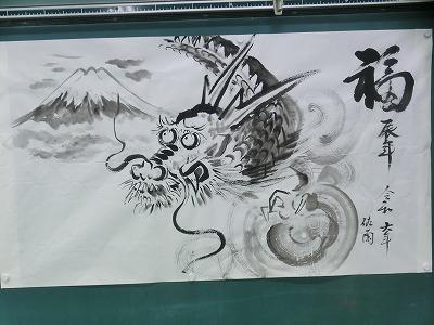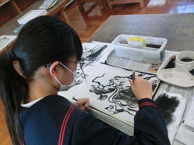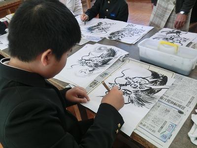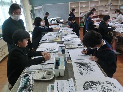 6年生が図工の時間に、吉田佐蘭先生と蘭墨会の皆さんに指導していただき、水墨画に挑戦しました。来年の干支にちなんで「辰」を描きました。墨の濃淡を上手に使ってのびのびとした作品を仕上げていました。
