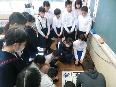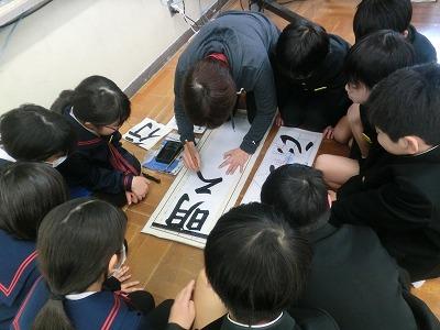 今年もあと2週間ほどになりました。それで、4~6年生が3学期初日に行われる書初め大会に向けて練習しました。講師は今年度から書写の指導に入っていただいている竹中先生です。先生のお話をしっかり聞いて各自練習に取り組みました。