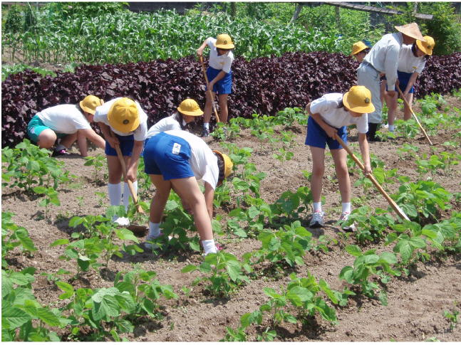 5年生は、総合的な学習で大豆を作っています。大豆作りの名人瀬戸町の高崎さんからご指導を受け、秋にはその大豆で味噌をつくる予定です。味噌づくりは去年から始め、今年で2年目になります。去年つくった味噌は、秋には味わうことができると思います。現6年生が首を長くして楽しみに待っています。なにかの行事で皆さんに味噌汁を振る舞うことができるといいのですが・・・。