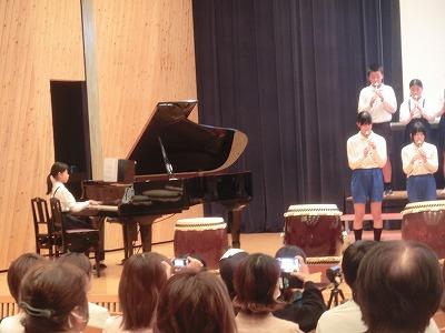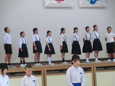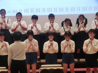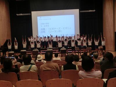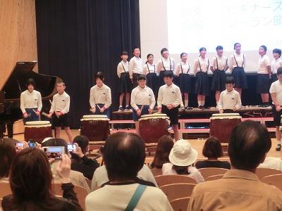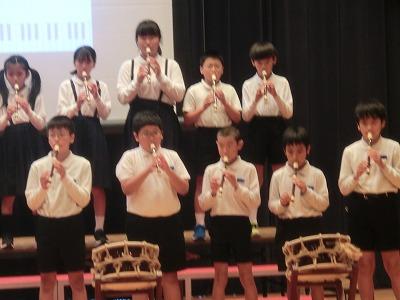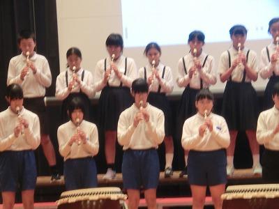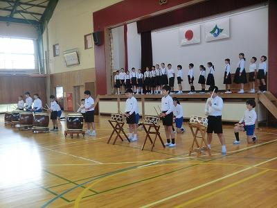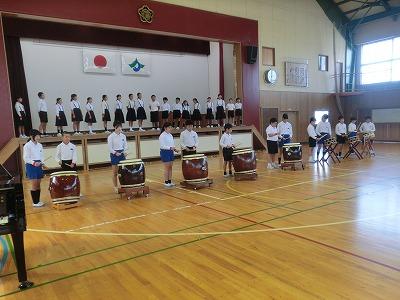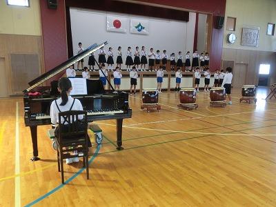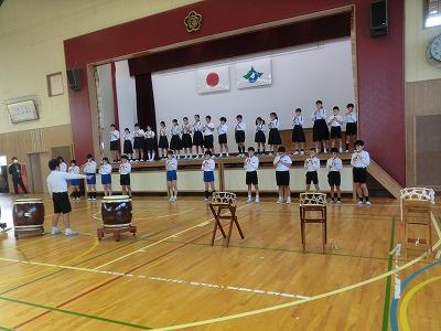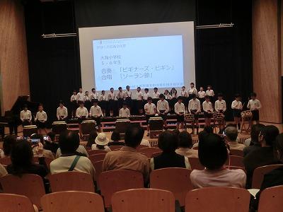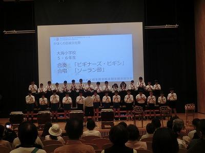 本日、河北台中学校講堂で「かほく市小中学校音楽会」が行われました。小学校は、6月に行われた市小学校音楽会で演奏した曲を中心に行われましたが、一部内容を変更した学校もありました。大海小学校は6月と同じ「ビギナーズビギン」と「ソーラン節」を演奏しました。「ソーラン節」では、5年生の力強い歌声と6年生の勇ましい太鼓がうまく調和して観衆を魅了しました。人数は少ないですが、それを感じさせない演奏でした。