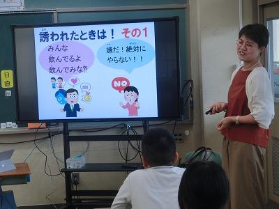 本日4限目に6年生対象に薬物乱用防止教室が行われました。金城大学の曽根志穂先生に来校していただき、薬物のこわさや誘われた時にどうするかについて詳しくお話していただきました。子供たちも真剣に聞いていました。