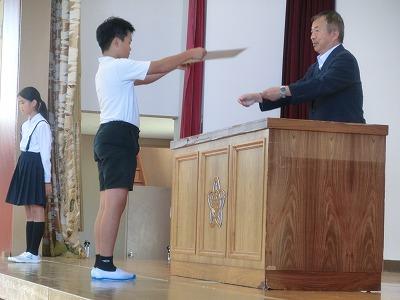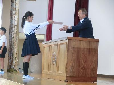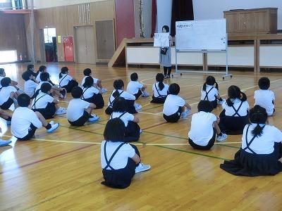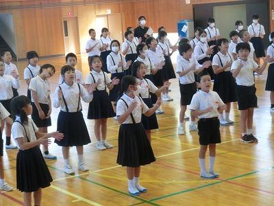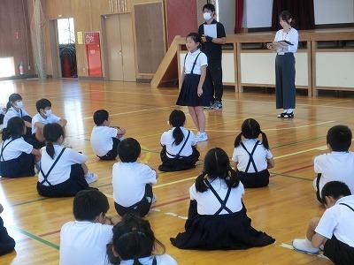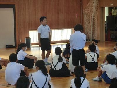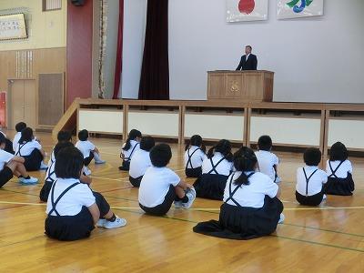 本日、全校集会を体育館で行いました。久しぶりの体育館での集会で、元気な校歌を歌う声が体育館中に響きました。まずは、夏休み期間に頑張った科学研究や川柳の表彰伝達を行いました。続いて校長先生からのお話(マラソン大会頑張ろう)、川井先生からのお話(集団登下校をしっかり)がありました。そして9月の生活目標の振り返りがあり、その後、諸岡先生から今月の生活目標(「時間を大切にしよう」)のお話がありました。最後に9月の歌(気球に乗ってどこまでも)を全校で歌って終わりました。聞く場面、声を出す場面のメリハリのあるいい集会でした。