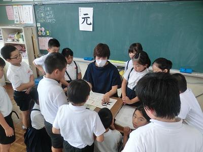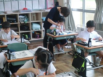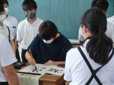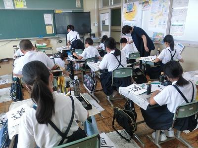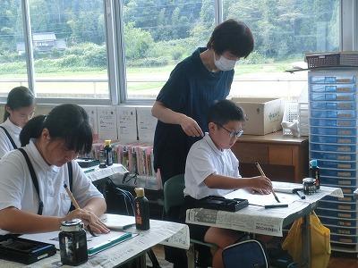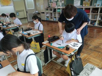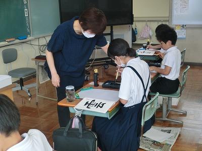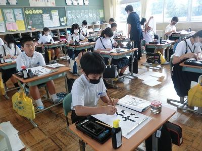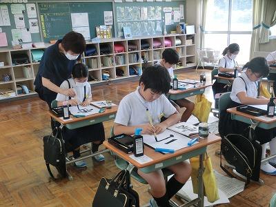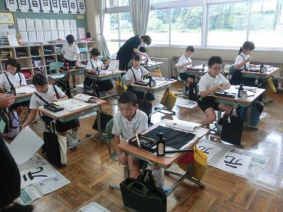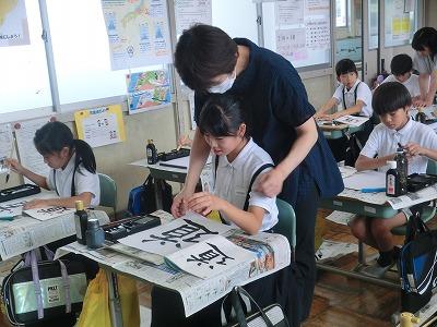 今、児童は河北郡市書写作品展に向けて練習を行っています。今年度から書写指導は高松地区にお住いの竹中絹子先生に来ていただき、指導していただいています。本日は午前中に、3~6年生が指導していただきました。真剣な表情で、一生懸命に字を書く様子は、とても凛々しく感じました。