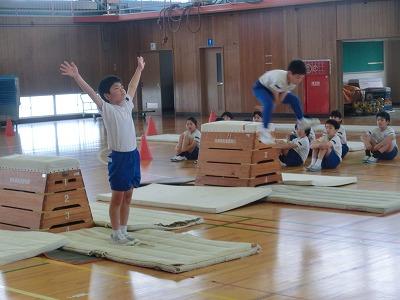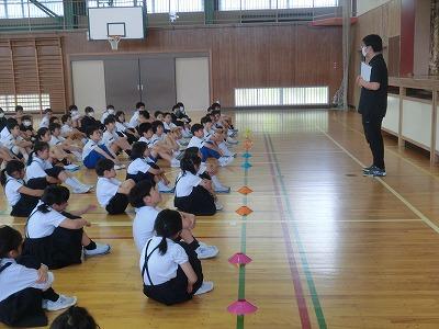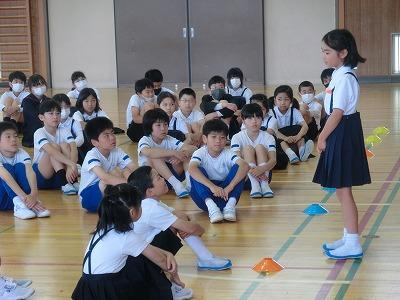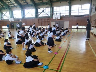 本日より6月。一学期の折り返し地点です。3限目に体育館で全校集会を行いました。集会後に器械運動交歓会のリハーサルをするために跳び箱やマットを設置したため、いつもとは違う場所に並びました。校歌、校長先生のお話に続いて、5月の生活目標の振り返りを行いました。皆、とても立派に発表できていました。その後、金子先生から今月の生活目標のお話があり、今月の歌を歌って、全校集会が終わりました。
