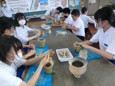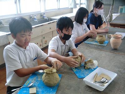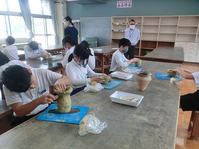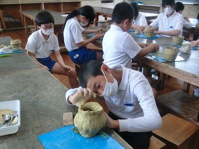 本日、1,2限目に6年生が土器作りに挑戦しました。かほく市教育委員会スポーツ文化課の方々にご指導いただきました。もっと時間がかかるかと思いましたが、皆、けっこう手際よく上手に作り上げていました。1か月ほど乾燥させてから焼いて完成するようです。焼き上がりが楽しみです。