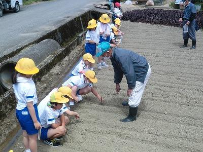 本日、3,4限目に3年生が味噌づくりのための大豆を植えに瀬戸町の畑に行きました。毎年お世話になっている髙﨑武義さん、髙崎政勝さんに今年も教えていただきました。今年は、先日珠洲で起こった地震からの復興を願い、珠洲の大浜大豆を植えました。子どもたちは列が真っすぐになるよう気をつけながら植えていきました。収穫する日が楽しみですね。