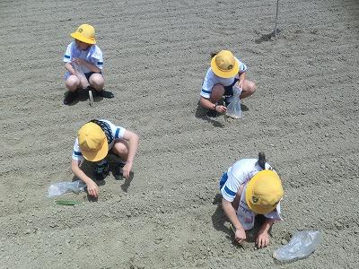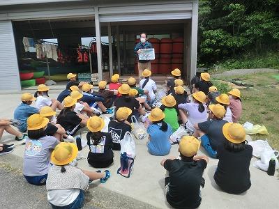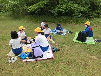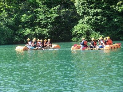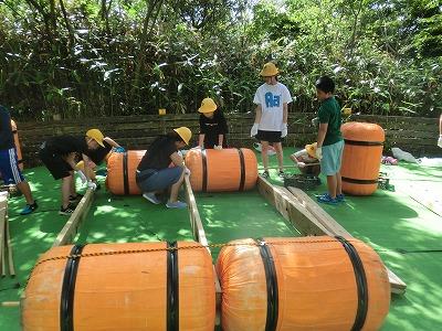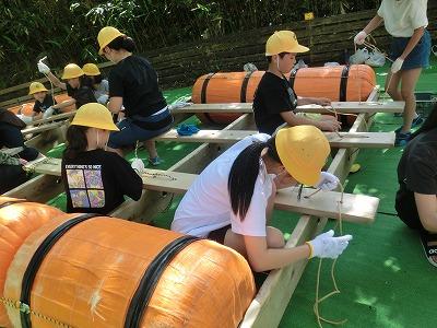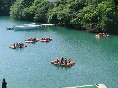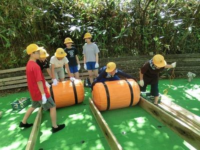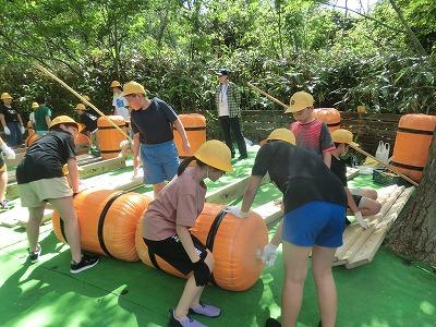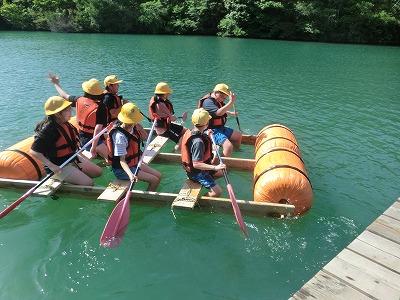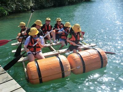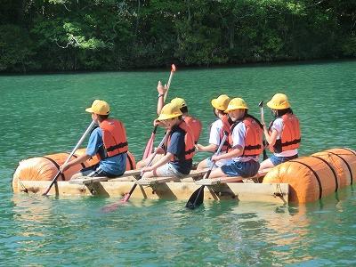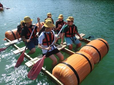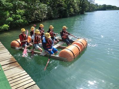 昼食後、いよいよ体験学習が始まりました。最初は、いかだ体験です。自分たちでいかだを組み立てて、池に浮かべてパドルを使って漕ぎます。班で協力してテキパキ動くことができました。ただ、池に入るとキャーキャー大騒ぎでした。おしりまでびちゃびちゃに濡れて気持ち悪かったのか、早く戻りたがる子もいて、まとまりに欠ける場面もありましたが、楽しく体験学習を終えることができました。