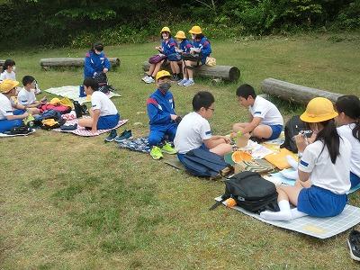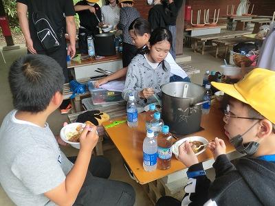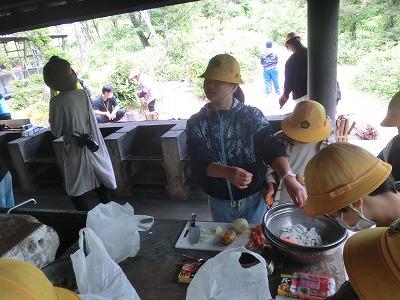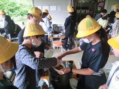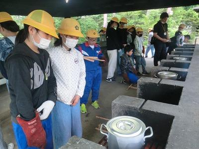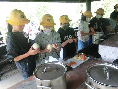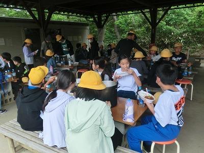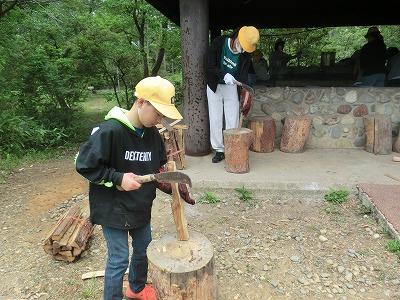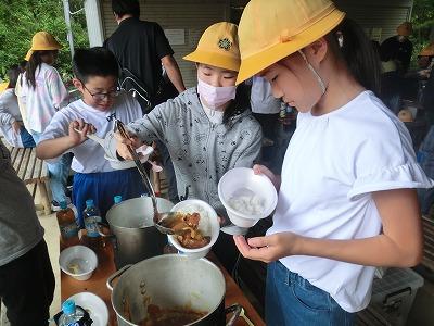2日目の活動は、野外炊飯です。カレーライスづくりに挑戦しました。各班、かまど係と調理係に分かれて取り組みました。かまど係はまき割からです。やり方のこつを教えてもらい、挑戦しました。もっと苦戦するかと思いましたが、とても上手にまきを割っていました。かまどの火も先生に手伝ってもらいながら、早く火をおこすことができました。各班協力しながら上手にカレーを作れたようです。そして、苦労して作った分、おいしくいただくことができました。