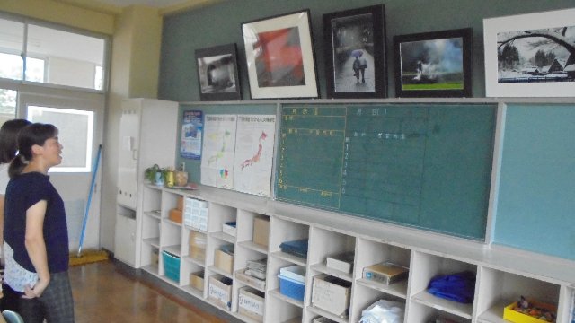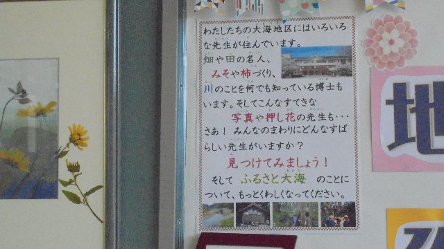 先日からいろいろな方の力をお借りしながら仕上げていた地域の方の作品を展示したコーナーが完成しました。3階、5.6年生の教室間の児童会室背面黒板を利用して、池田コーディネーターがコミスク事業の新しい取組として中心になって作りました。