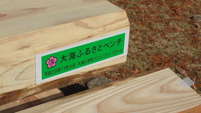 秋晴れの中新しく設置されたベンチが輝いています。どうですか、ビックでしょう。重さ600kgは優にあります。11月4日土曜日は、雨で予定していたお披露目会のセレモニーが外でできなくて残念でした。ネームプレートが見えますね、ニックネームは「大海ふるさとベンチ」に決定しました。たくさんのご応募ありがとうございました。