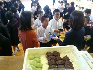 出来上がったおもち、来校者の皆さん、そして全校でおいしく頂きました!