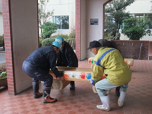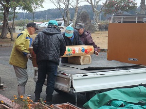 冬になり、各地区のみなさんが学校にベンチを取りにおいでました。