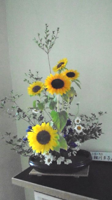 もう一枚の写真は今週の玄関の生け花です。外の梅雨空を吹き払うような夏真っ盛りのひまわりがきれいです。