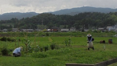 体育館前の梅の実も大きく熟してきています。そのわきでは盛戸さん夫妻が畑の世話をして下さっています。長雨で草がすごく伸びてしまいました。