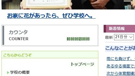 ところで本日29万8千を超え、そろそろ30万の大台だな・・・週末休みに到達するかなと考えていたら・・・今PCをのぞいてみるとご覧のように30万を超えていました。400近く超えています。びっくりです。本当にいつもこまめに見ていただきありがとうございます。今後も子ども達・学校の様子がよくわかる情報を発信していきます。