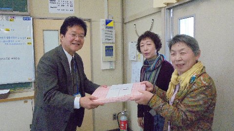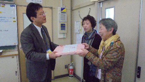 女性会会長さんがおいでて、新入生への贈り物を持ってきて下さいました。毎年いただいています。入学してから毎日使う連絡袋です。これを使って学校と家庭の連絡のやりとりをします。ほとんどの学年が大切に長く使っています。本当にありがとうございます。入学式でご披露し配布させていただきます。