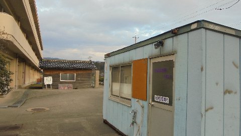 今日、給食搬入口近くの空きスペースに「事務所」がオープンしました。春休みから工事が始まり、そのための仮設の事務所です。何の工事だと思いますか?なんと教室にエアコンがつくことになりました。今年の夏から涼しい教室で勉強・・・考えただけで待ち遠しいですね。