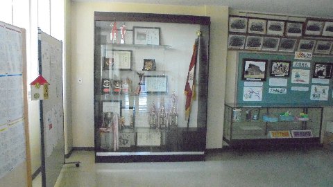 体育館に通じる廊下の曲がり角にある立派な陳列ケース。しばらく入れ替えがなくほこりにまみれていました。いろいろな表彰に関わるものが飾られていますが、10年20年前のものがいっぱい。学校表彰だけでなく地域の表彰、公民館やスポーツ少年団のものがかなり見受けられました。