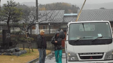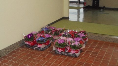 写真:雨の中松の木の雪つりを若緑の瀬戸さんに外していただきました。職員玄関には道原さんから卒業式を飾る花が届けられました。