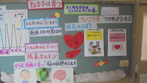 2017年2月8日 08時33分 先週は、学校保健委員会が開催されました。今回のテーマは早寝でしたね。いま、保健室前は、「睡眠と成長ホルモン」など分かりやすい掲示がされています。