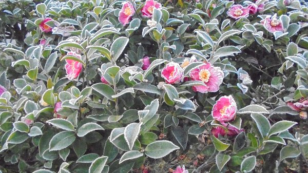 二十日は「大寒」、すごく冷え込みました。朝一面に霜が降り、外の水は凍っていました。歩道のサザンカは真っ白、池の水もカチンカチン・・・プールも。氷を割って渡すとまるでガラスのようにきれいでした。