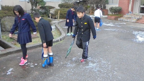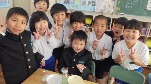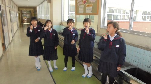 1年生の教室では、給食を食べていたとき歯が抜けた子がいました。みんなまわりに集まってきて、ああだこうだと歯の始末について・・・2階の廊下ではこんなに寒くても水が冷たくてもしっかり歯磨きしている4年生に会いました。