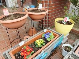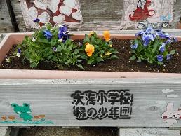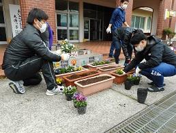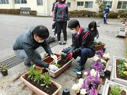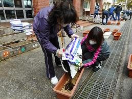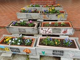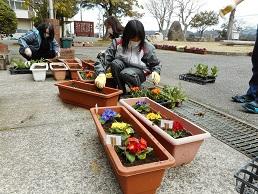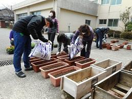 卒業式も近くなってきました。冬の間そのままになっていた玄関前のプランターの土を入れ替え、6年生に喜んでもらえるように、職員で協力して花を植えました。