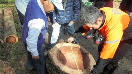 伐採した学校林の杉です。ここで静かに寝かせて、いろいろな処理をしてもらいます。